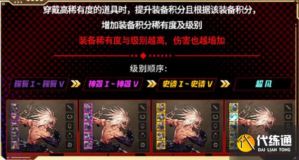 根据全身穿戴装备的积分,可提高积分套装等级,获得属性,最高可到超凡级