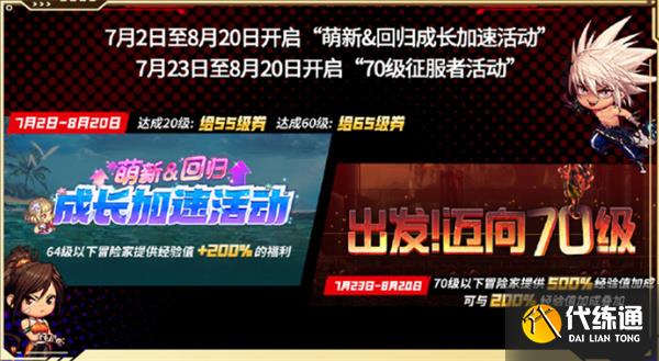 7月2日~8月20日开启萌新&回归成长加速活动,64级以下可得200%经验