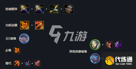 杀人剑提升瑞文的攻击力,因为锐雯有AOE技能,所以能够很快把杀人剑叠满。飓风则提升锐雯攻速的同时,还能对其余敌人造成弹射伤害。当前版本的肉很多,比如骑士、铁甲卫士、斗士等等,轻语能提升瑞文的打坦能力。刀妹出基克的先驱要和瑞文站在一起,伏击之爪保护刀妹的同时还能反控制对手,豹女带一个窃贼手套混即可。