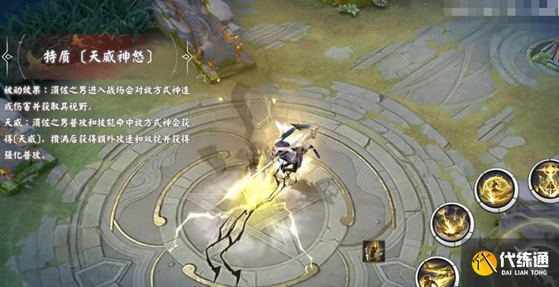 特质技能包含被动和天威双重效果,被动效果让他在进入战场时就能对敌方造成伤害并获取视野,天威效果则通过普攻和技能命中叠加,叠满后能获得攻速提升、双抗加成和强化普攻,大幅提升持续作战能力。