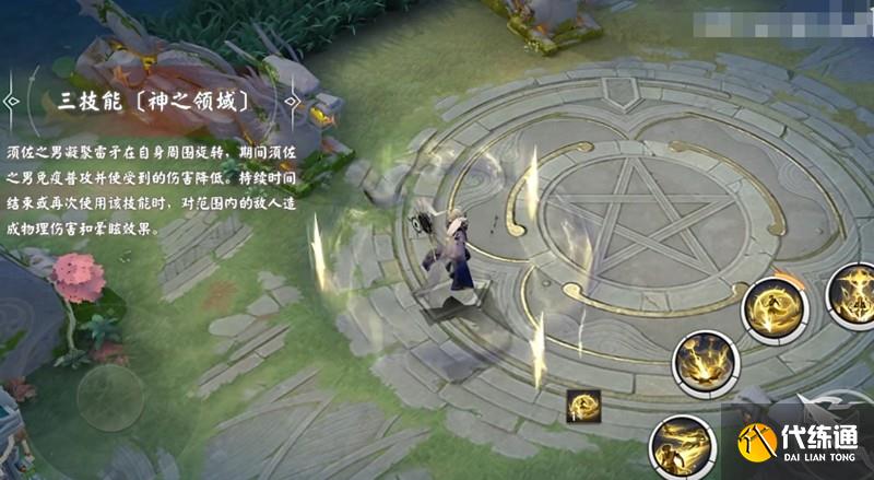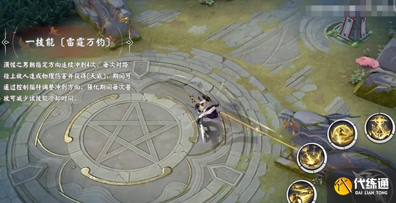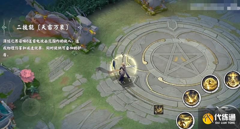 一技能雷霆万钧是核心输出手段,能够进行四次冲刺攻击,期间可以调整方向并衔接普攻,不仅能造成额外伤害还能减少技能冷却。二技能天雷万象是强力的AOE技能,附带减速效果和护盾加成,既可用于消耗也能用于留人。三技能神之领域能免疫普攻并获得减伤,还能对周围敌人造成眩晕,是反制物理输出的强力技能。