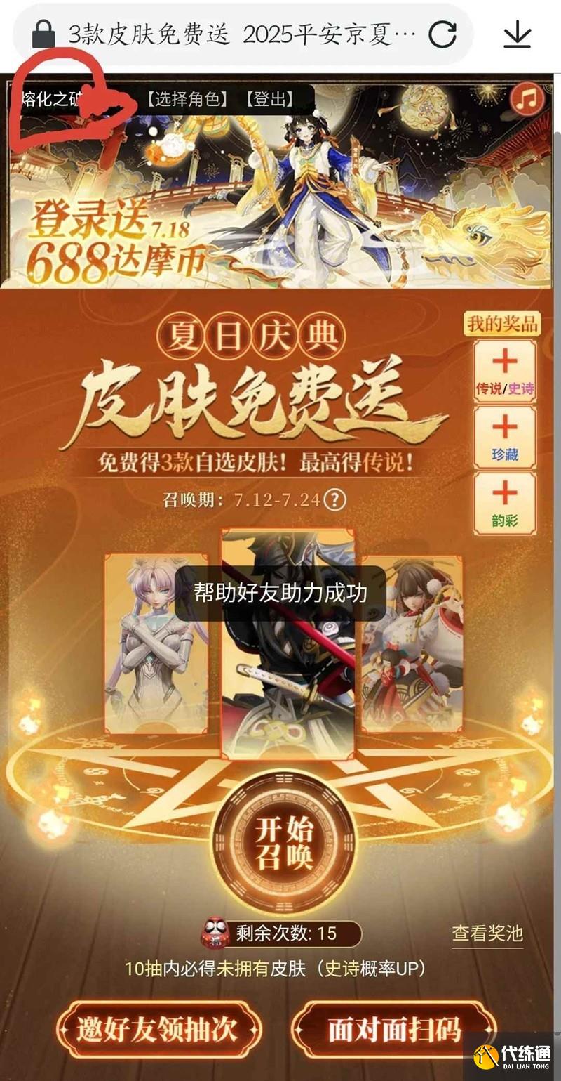 平安京在7月12-24号,可以免费抽皮肤最后自选三款领取。为方便大家早日刷到心仪的皮肤,告别拼刀互助,特此出一个单人速刷攻略。