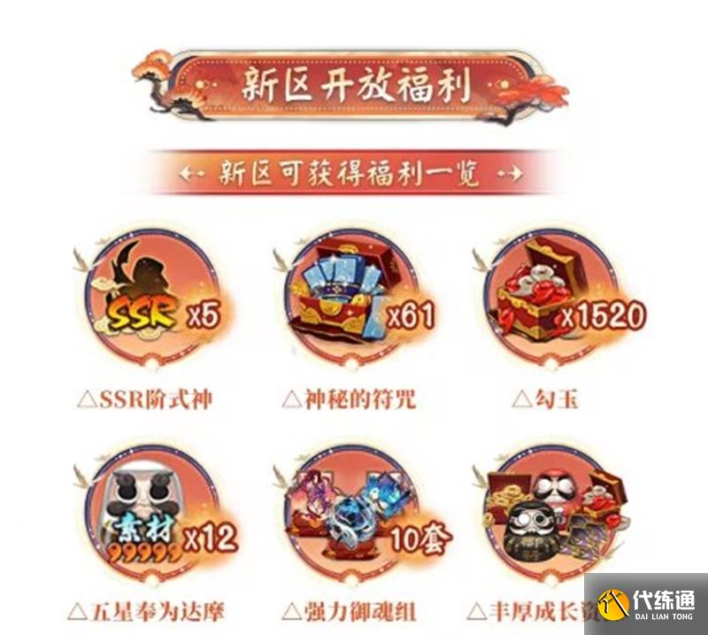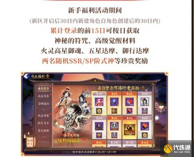 新手福利活动期间(新区开启后30日内新建角色自角色创建后的30日内)累计登录的前15日可按日获取神秘的符咒、高级觉醒材料火灵高星御魂、五星达摩、御行达摩。