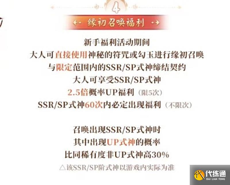 新手福利活动期间大人可直接使用神秘的符咒或勾玉进行缘初召唤与限定范围内的SSR/SP式神缔结契约大人可享受SSR/SP式神2.5倍概率UP福利(限5次)SSR/SP式神60次内必定出现福利(不限次)。
