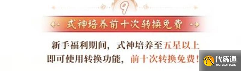 新手福利期问,式神培养至五星以上即可使用转换功能,前十次转换免费!