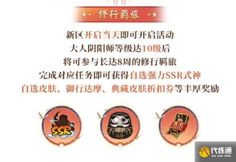 新区开启当天即可开启活动大人阴阳师等级达10级后将可参与长达8周的修行羁旅完成对应任务即可获得自选强力SSR式神自选皮肤、御行达摩、典藏皮肤折扣券等丰厚奖励。