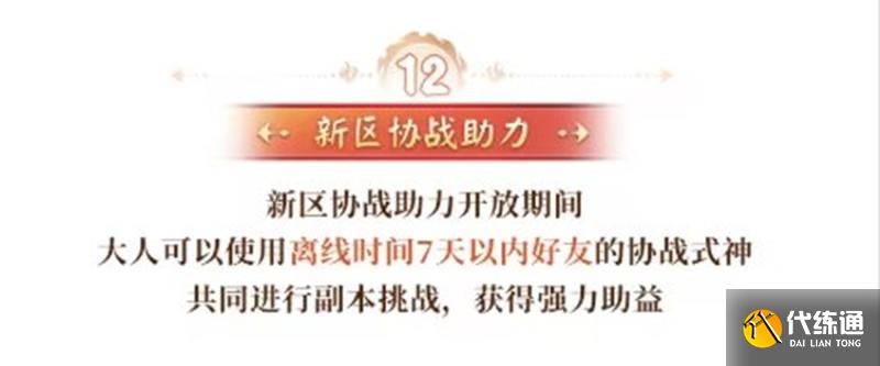 新区协战助力开放期间大人可以使用离线时间7天以内好友的协战式神共同进行副本挑战,获得强力助益。