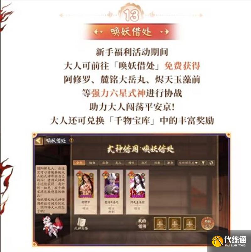 新手福利活动期间大人可前往「唤妖借处」免费获得阿修罗、麓铭大岳丸、烬天玉藻前等强力六星式神进行协战助力大人闯荡平安京!大人还可兑换「千物宝库」中的丰富奖励。