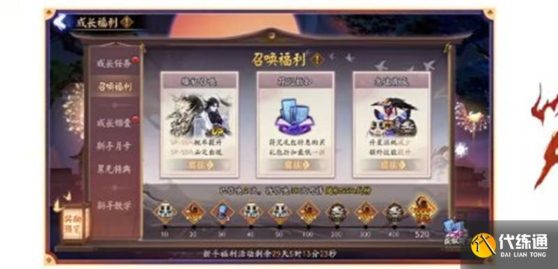 新手福利活动期间(新区开启后30日内新建角色自角色创建后的30日内)累计登录的前15日可按日获取神秘的符咒、高级觉醒材料火灵高星御魂、五星达摩、御行达摩。