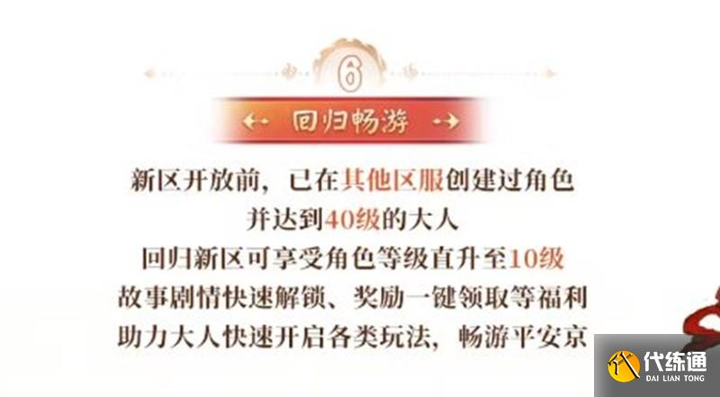 新区开放前,已在其他区服创建过角色并达到40级的大人,回归新区可享受角色等级直升至10级故事剧情快速解锁、奖励一键领取等福利助力大人快速开启各类玩法,畅游平安京。