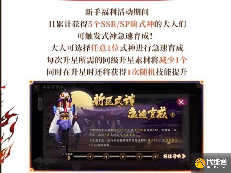 新手福利活动期间日累计获得5个SSR/SP阶式神的大人们可触发式神急速育成!大人可选择任意1位式神进行急速育成每次升星所需的同级升星素材将减少1个同时在升星时还将获得1次随机技能提升。