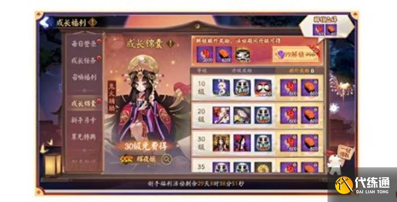 活动期间,大人可在升至特定等级时免费领取育成素材、式神契约书、御行达摩等丰厚奖励助力大人成长,畅行平安京~大人还可购买解锁等级锦囊额外奖励获取大量勾玉、体力等奖励。