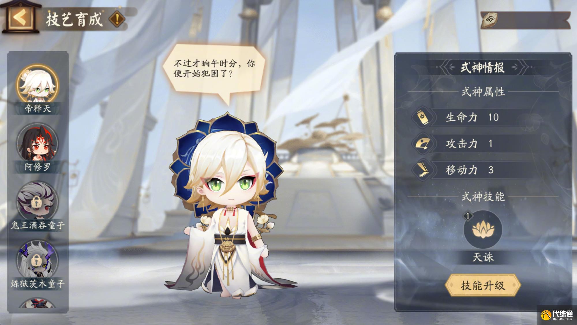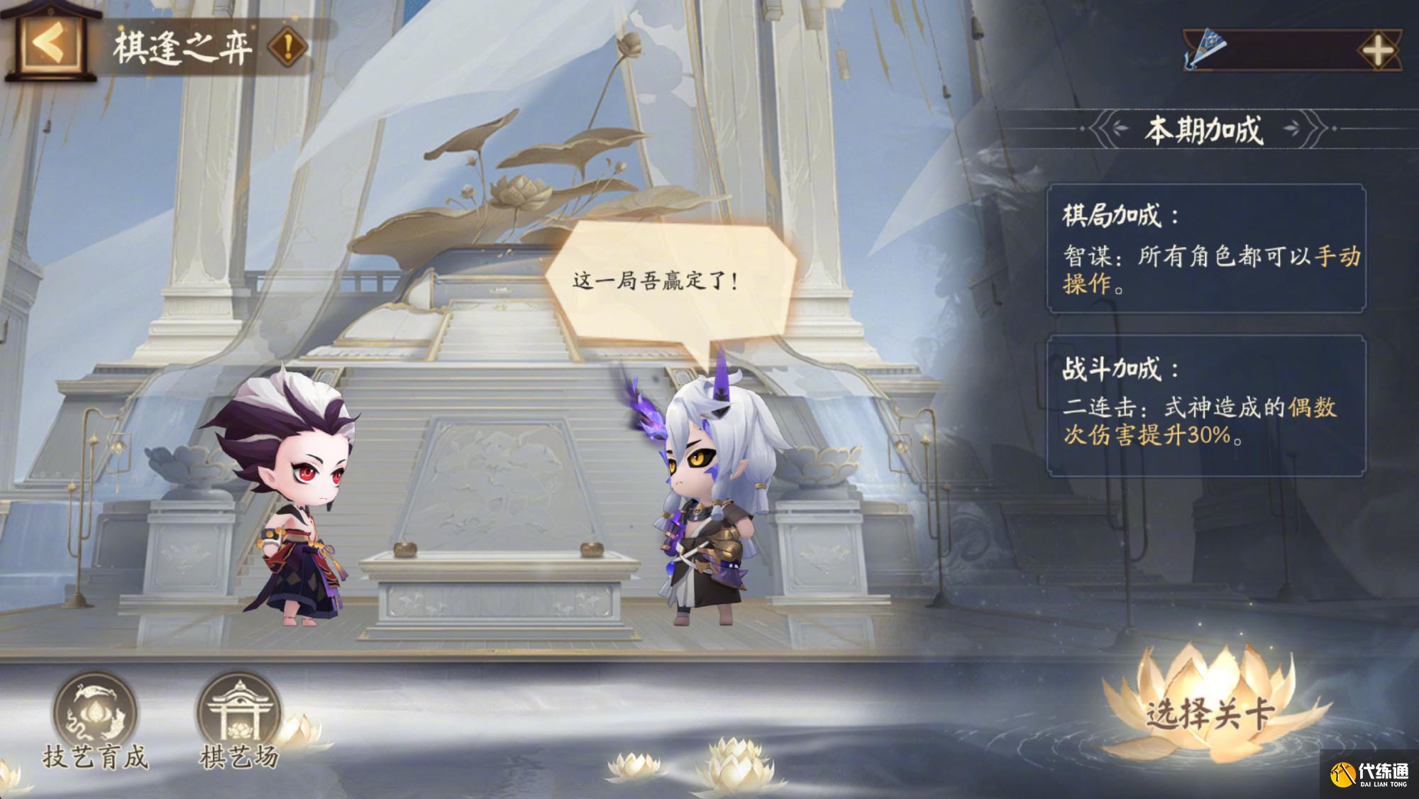 ※技艺育成:大人可对角色的技能进行升级,升级所消耗的技能点可以通过角色任务获取。大人还可在「棋艺场」中购买新角色,购买的角色及未消耗的技能点会在活动下次开放时依然保留。