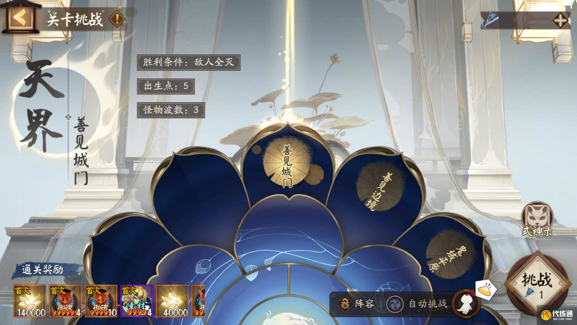 ※关卡挑战:关卡挑战开启时间为7月23日至7月31日,前7日的每天0点解锁一个新的关卡,大人可通过消耗「天元扇」选择挑战关卡。在副本战斗开始前大人可选择本局中需要控制的式神,取得副本胜利即可获得随机御魂等掉落奖励,并结算角色任务。