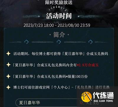 1、在2023年7月23日——2023年8月30日活动期间,每一位玩家均可获得夏日嘉年华合成玉兑换码;