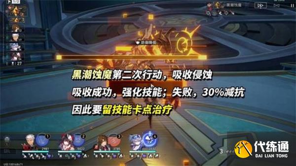 黑潮蚀魔:第二次行动吸收我方身上侵蚀,强化自身。若提前治疗解除侵蚀,则吸收失败并触发其30%减防。