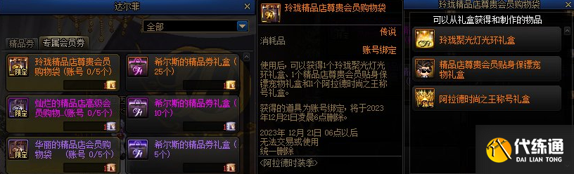 3、而且专属会员券可兑换为精品券或者364天期限且无属性的光环+宠物+称号组合。