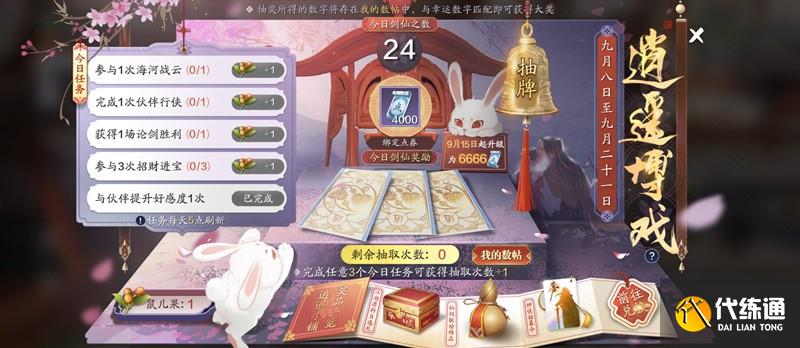活动界面中央是仙剑之数抽奖区域。每完成三个每日任务就能获得一次抽牌机会,抽到的数字如果与仙剑之数显示的数字一致,就能赢得4000绑定点券奖励。虽然绑定点券不能直接充值使用,但在游戏内也是相当实用的货币资源。