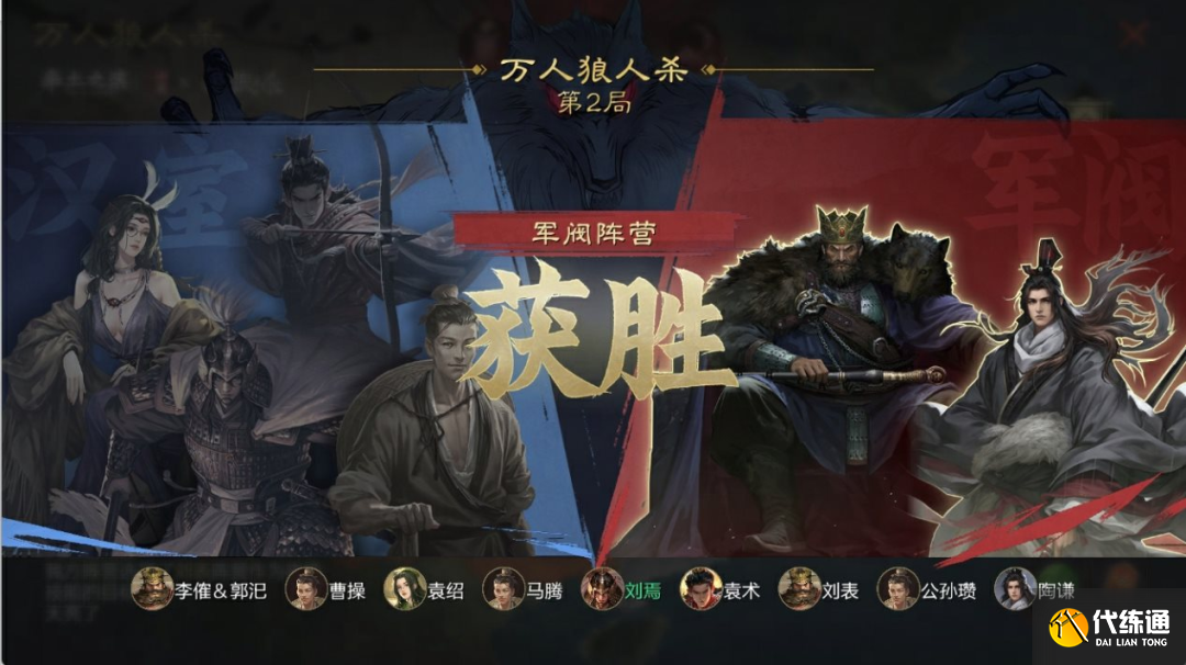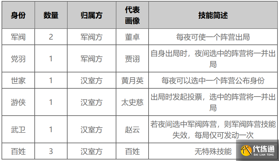 典型的“屠边”规则。军阀方需要淘汰所有特殊身份的汉室方阵营(世家、游侠、武卫)或所有百姓阵营;汉室方则需要将三个军阀方阵营(军阀×2,党羽×1)全部投票出局。