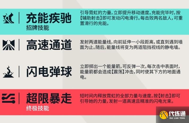 超限暴走是霓虹的大招,激活后她将释放出高伤害的闪电光束,同时重置闪电滑行的充能次数。这使得她在大招期间可以更频繁地进行位移,提升战场生存能力和输出效率。在团战中,建议优先击杀低血量敌人,这样可以延长技能持续时间,让她在战场上持续压制对手。同时,利用加速效果抢占关键位置,为团队创造优势。