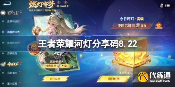 王者荣耀开启了燃灯寄梦活动,可以获得限时点券。在活动中玩家可以完成活动来获取一定的限时点券,通过其他玩家分享的河灯分享码可以获得更多的点券。那么王者荣耀河灯分享码有哪些呢?下面一起来看看王者荣耀河灯分享码大全8.22吧。
