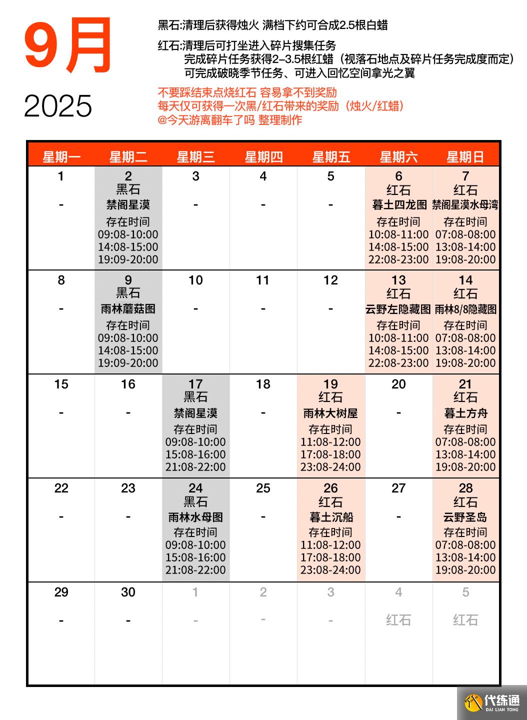 大家知道9月光遇的红黑石在什么时候,哪些地方掉落呢?相信大家都想知道碎片具体的掉落点位?下面为大家带来光遇9月红石日历2025,感兴趣的玩家们千万不要错过哦!