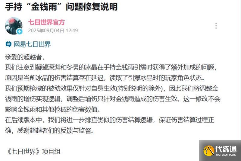 七日世界金钱雨额外加成怎么没了?很多小伙伴最近都在疑惑这个问题,那么这是怎么回事呢?那么七日世界金钱雨额外加成怎么了?下面小编带来七日世界金钱雨最新调整公告,我们来一起看看吧。