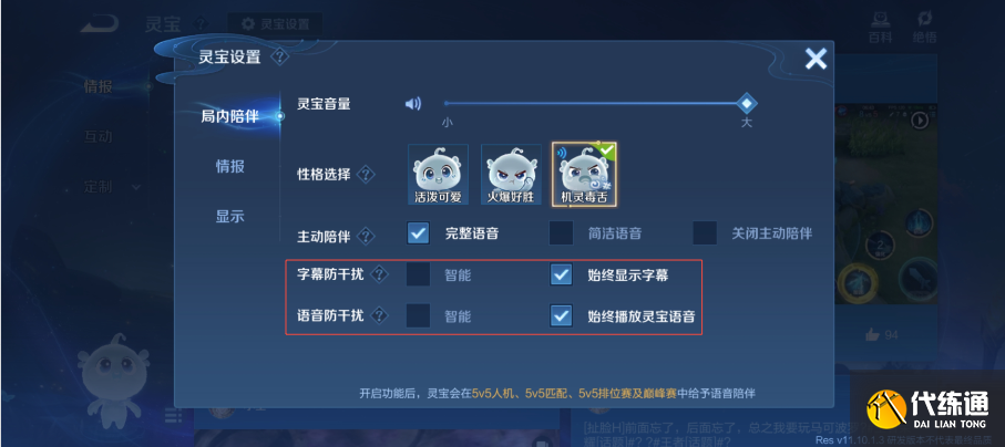 开启字幕防干扰后会始终展示右上角灵宝字幕,可能对战场信息产生遮挡;开启语音防干扰时将始终播放灵宝语音,可能对组队语音产生影响,想要更完整的体验灵宝功能的玩家推荐打开哦。