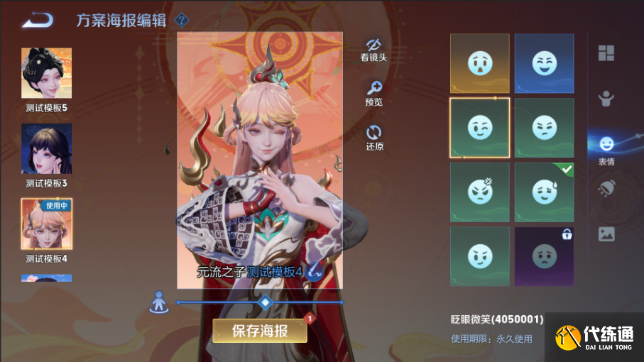 版本更新后,玩家可以在元流之子衣橱中,点击拍摄海报,对当前穿搭进行海报编辑。海报的编辑界面也对应了丰富的搭配资源,可自定义动作、表情、灯光、背景。
