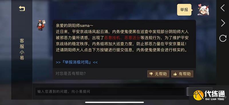决战平安京官方一直致力于为各位阴阳师大人提供更好的游戏环境,包括但不限于对游戏中的不良竞技行为加大处罚力度,持续完善举报系统和提高举报反馈速度等。