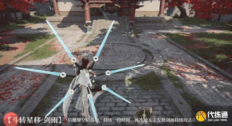 斗转星移剑雨是无尘的爆发型奥义,通过挥剑如雨、化气为刃的方式后撤滞空,飞剑会化作剑雨持续攻击敌人。小剑可以破坏敌人的武器,大剑则会精准追踪目标。当气力提升到金色阶段时,剑雨的终结一击会在敌人头顶降下金色飞剑,形成强力的空中制裁效果。这个技能在追击敌人或清理战场时都非常有效。