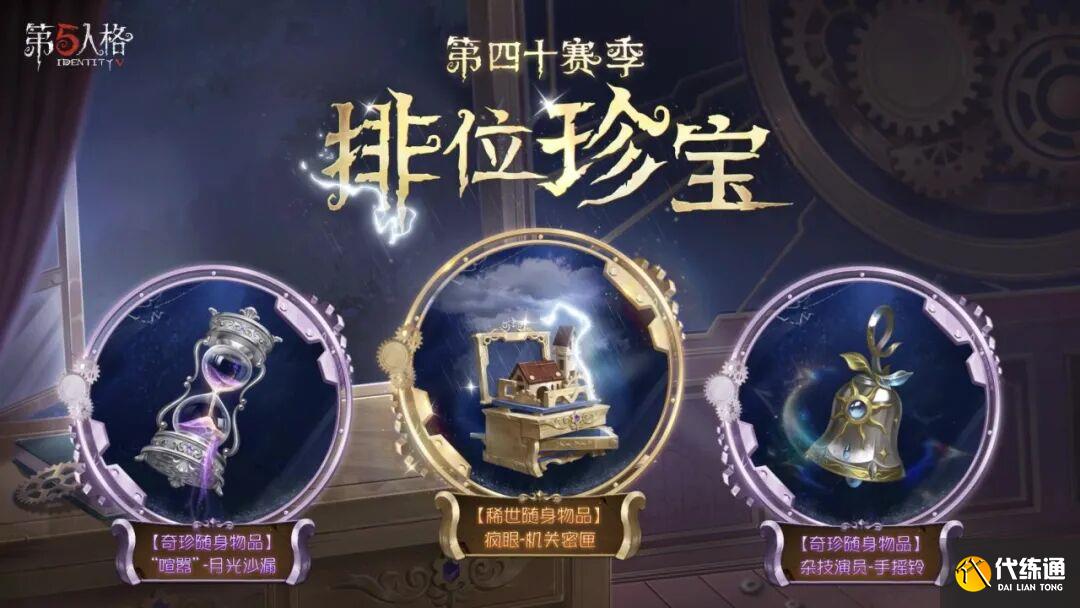 ●【排位珍宝】:第四十赛季,每日完成三场排位赛即可在次日0点领取对应的排位珍宝,有机会获得【稀世随身物品】疯眼-机关密匣、【奇珍随身物品】杂技演员-手摇铃和【奇珍随身物品】“喧嚣”-月光沙漏,珍宝等级将会根据玩家当前求生者和监管者中最高段位进行发放;