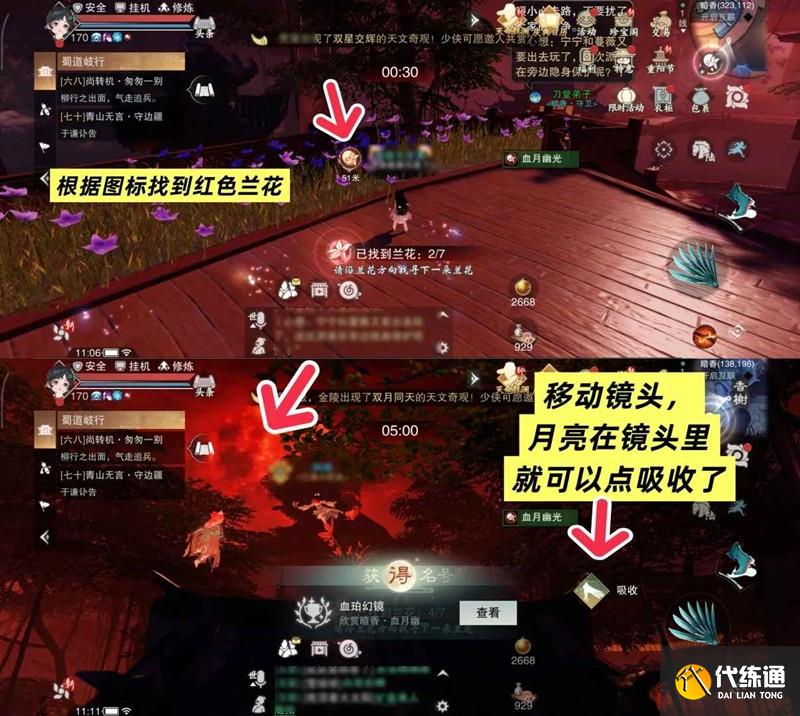 在限时活动里面点江湖奇景前往,自动寻路到暗香。移动镜头,看见血月就可以吸收兰花了(不用打开拍照镜头),然后根据图标指引找到七朵兰花,完成成就任务。