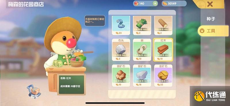 在商店消耗品栏目中也能找到红木。除了种子之外,这里还出售鱼饵、矿石、化肥等各种资源。每份红木售价10摩尔币,农场主可以通过积攒游戏货币进行购买。适当参与游戏内活动也能获得更多摩尔币。