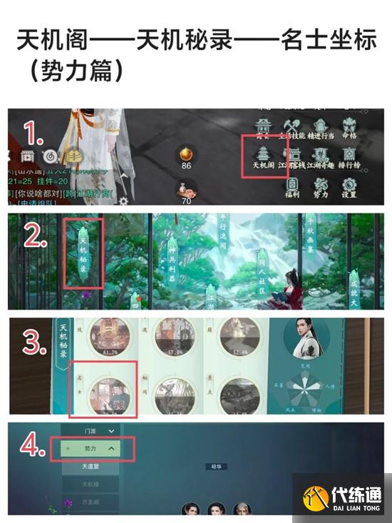 一梦江湖中游戏众生百态汇集了江湖中有知名度的NPC们,玩家在进行剧情冒险的时候都需要和这些人物都交道,每个NPC都有对应的好感,通过赠送礼物可以增加好感。那么游戏中天机秘录npc势力的坐标都在哪里呢?小编为你准备了一份攻略,一起来看看吧~