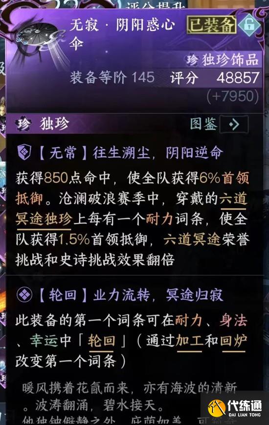 装备推荐,核心装备是老五伞,其他团本独珍只有老四羽毛、老六衣服、老六项链,包括老五伞在内,最多可以有4个可以加工耐力词条的团本独珍,合计6%首领抵御(荣誉/史诗战斗中翻倍),七独珍与否只增加输出,可以不带戒指(七个独珍以上即可激活“定海”)