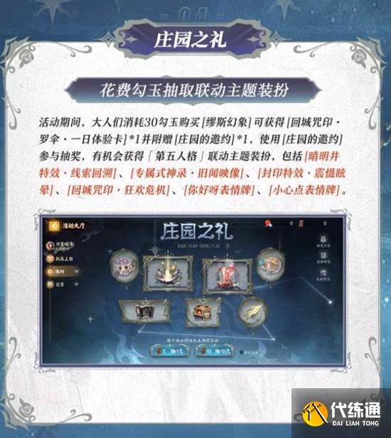 活动期间,玩家消耗30勾玉购买[缪斯幻象]可获得[回城咒印·罗伞·一日体验卡]*1并附赠[庄园的邀约]*1,使用[庄园的邀约]参与抽奖,有机会获得[第五人格]联动主题装扮。