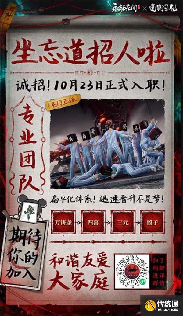 在这次联动中,玩家将有机会加入“坐忘道”,体验一套独特的晋升体系。晋升路线以麻将牌型为灵感设计,从“万、饼、条”基础位阶出发,逐步突破“四喜”“三元”等境界,最终向组织最高位“骰子老大”发起冲击。