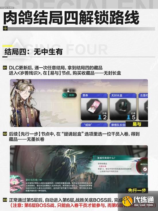 第一次进<易与>就可以看到“无封长盒”,之后再找一个<先行一步>让一个干员提前入卷就能拿到“无墨长卷”就可以去打第四结局了