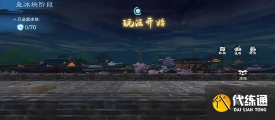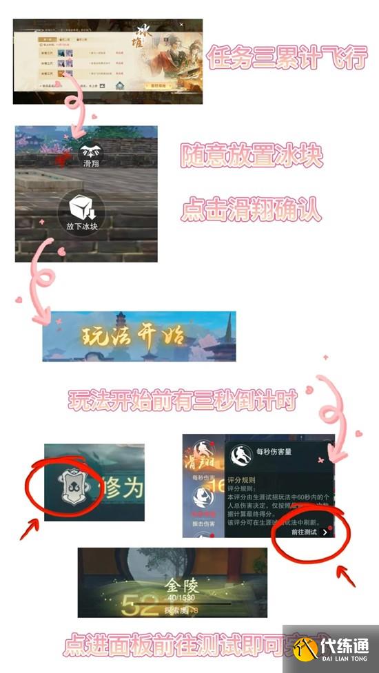 这里解释一下,就是随意放置一个冰块,点击滑翔之后,会进入三秒倒计时,滑翔玩法才会开始,三秒倒计时时间内,点进个人面板,点击修为左边的那个符的图案,然后每秒伤害量点击前往测试即可传送至金陵木桩,秒完成500米的距离,任务三完成