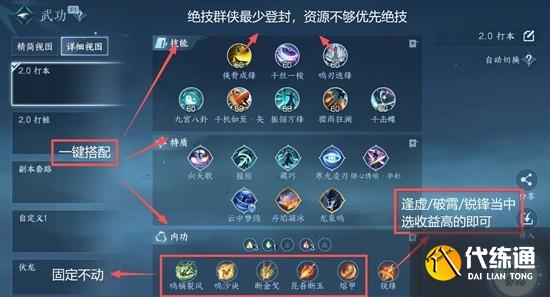 固定内功为:鸣镝裂风/鸣沙诀/断金戈/昆吾/熔甲,最后一个内功从逢虚/破霄/锐锋/破戟当中选收益最高的即可!