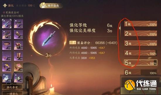 2.强化,不要补缀不要补缀!什么是补缀?看最后一张图,不足200%你再去点第二次就叫补缀,我们雨露均沾,先把所有位置都点到5级,不足200%也别管它,就这样先放着!!强化顺序:武器>手套>饰品们>其他。