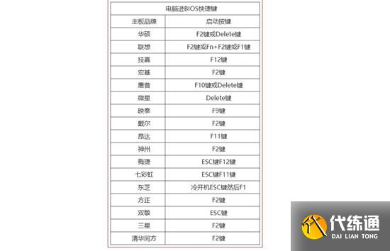 注意:各个主板品牌的BIOS启动按键不同,玩家可查看下图整理的信息或者百度搜索自己主板品牌BIOS启动按键。