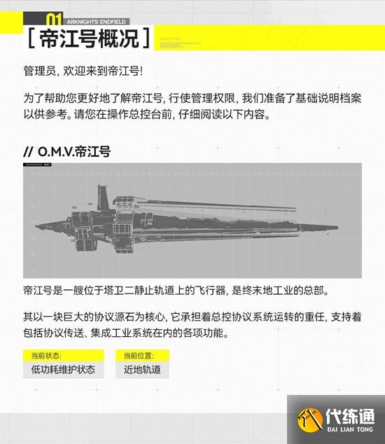 明日方舟:终末地游戏中玩家将成为终末地工业的管理员,率领您的干员们,保卫、拓展人类的边疆。探索塔卫二,收集资源,利用集成工业系统攻克险境,管理员,欢迎来到帝江号!为了帮助您更好地了解帝江号,行使管理权限,我们准备了基础说明档案以供参考。请您在操作总控台前,仔细阅读以下内容。