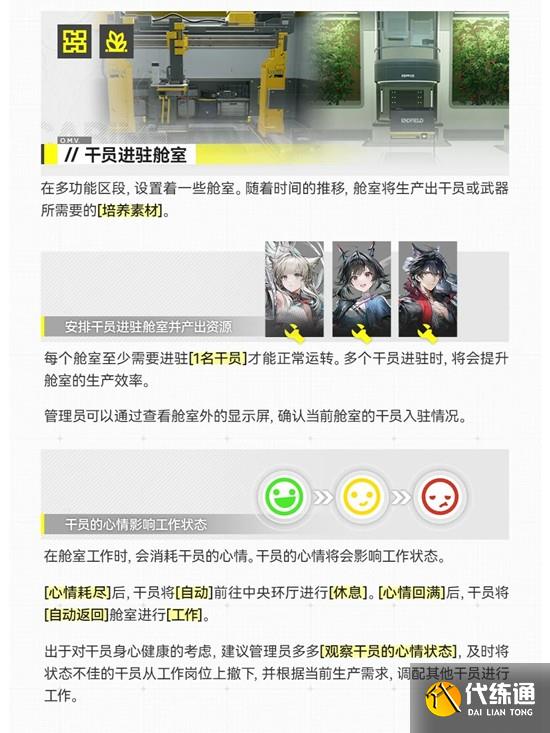 每个舱室至少需要进驻[1名干员]才能正常运转。多个干员进驻时,将会提升舱室的生产效率。
