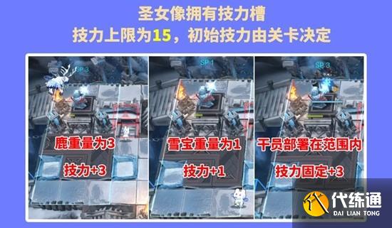 当我方干员部署在圣女像的作用范围内则圣女像将固定增长3点技力对于任意再部署性质的技能也会为圣女像增长技力,但受“雪崩”影响的单位再部署不会增长技力