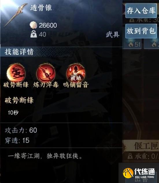透骨锥 主要是用于打架,装备差不多的情况下先手基本就能赢(炼刃-破势-绝技-一键)。