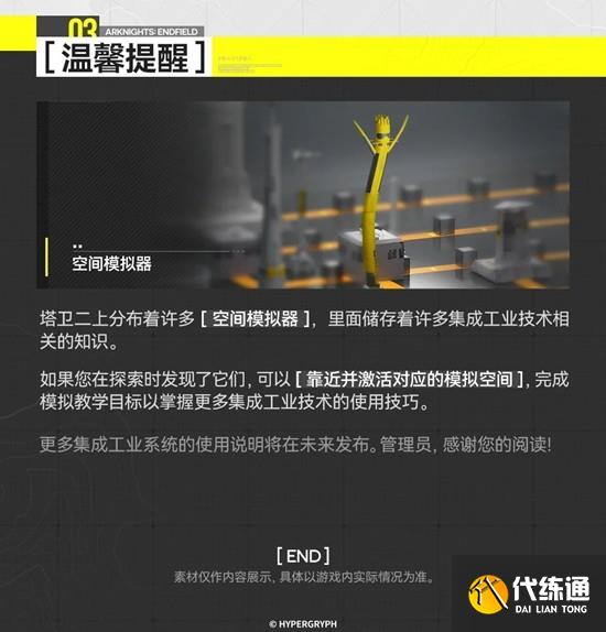 如果您在探索时发现了它们,可以[靠近并激活对应的模拟空间]完成模拟教学目标以掌握更多集成工业技术的使用技巧。