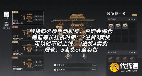 睡前等长挂机时间:3进货3卖货当库存到1500左右:2进货4卖货(需要时不时上线看看库存,当库存到两位数调整为3进货3卖货)