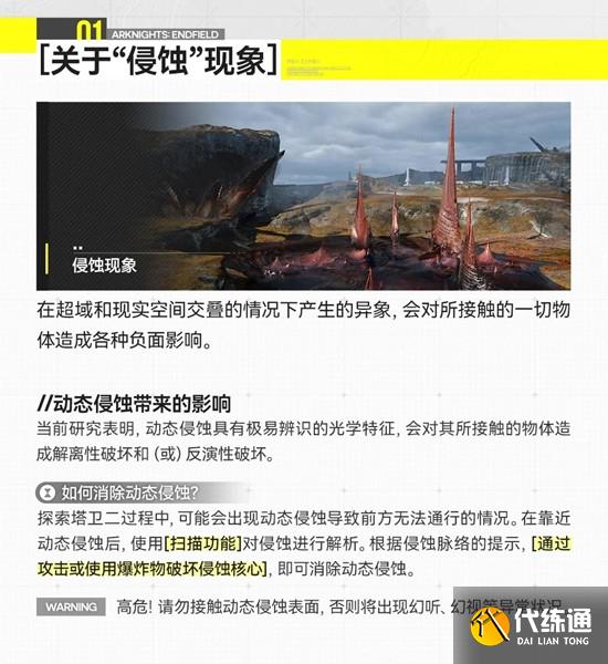 探索塔卫二过程中,可能会出现动态侵蚀导致前方无法通行的情况。在靠近动态侵蚀后,使用[扫描功能]对侵蚀进行解析。根据侵蚀脉络的提示,[通过攻击或使用爆炸物破坏侵蚀核心],即可消除动态侵蚀。高危!请勿接触动态侵蚀表面,否则将出现幻听、幻视等异常状况